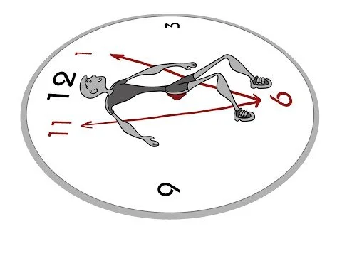 Move your pelvis following this pattern: 6 → 1 → 6 → 11, paying special attention to positions 1 o’clock and 11 o’clock.