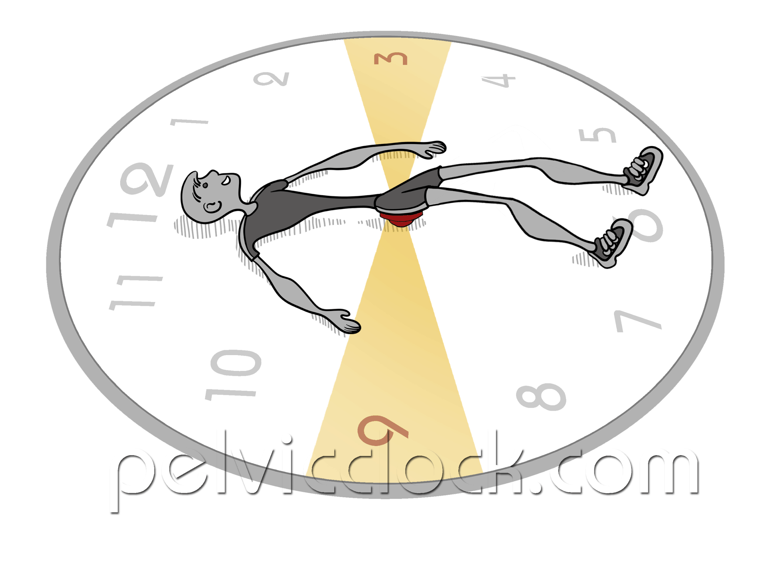 Ground your feet and tilt your pelvis back toward the 12 o’clock marker (in the direction of your head). Take a breath and tilt your pelvis forward toward the 6 o’clock marker (in the direction of your feet).